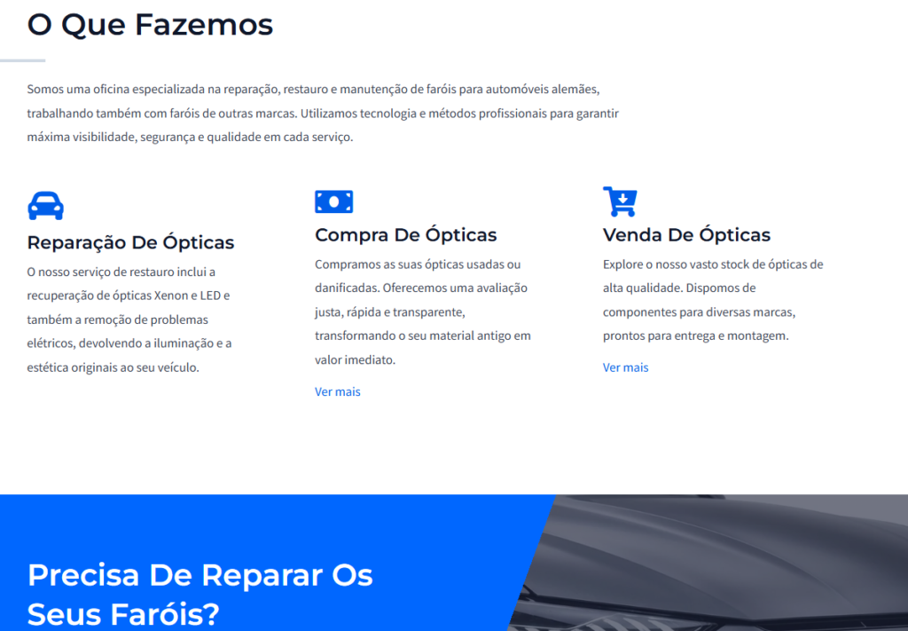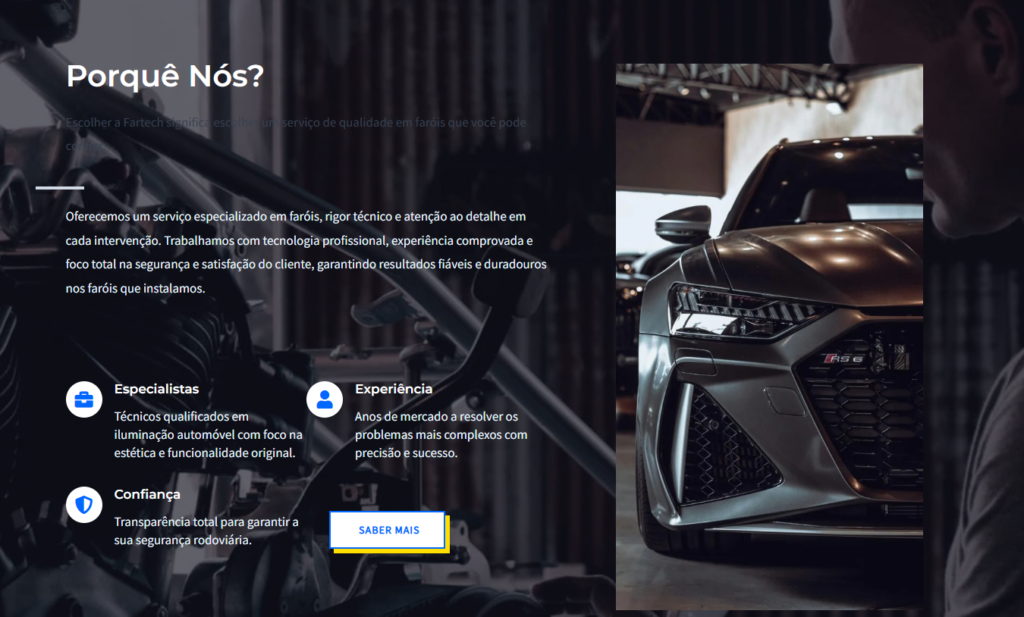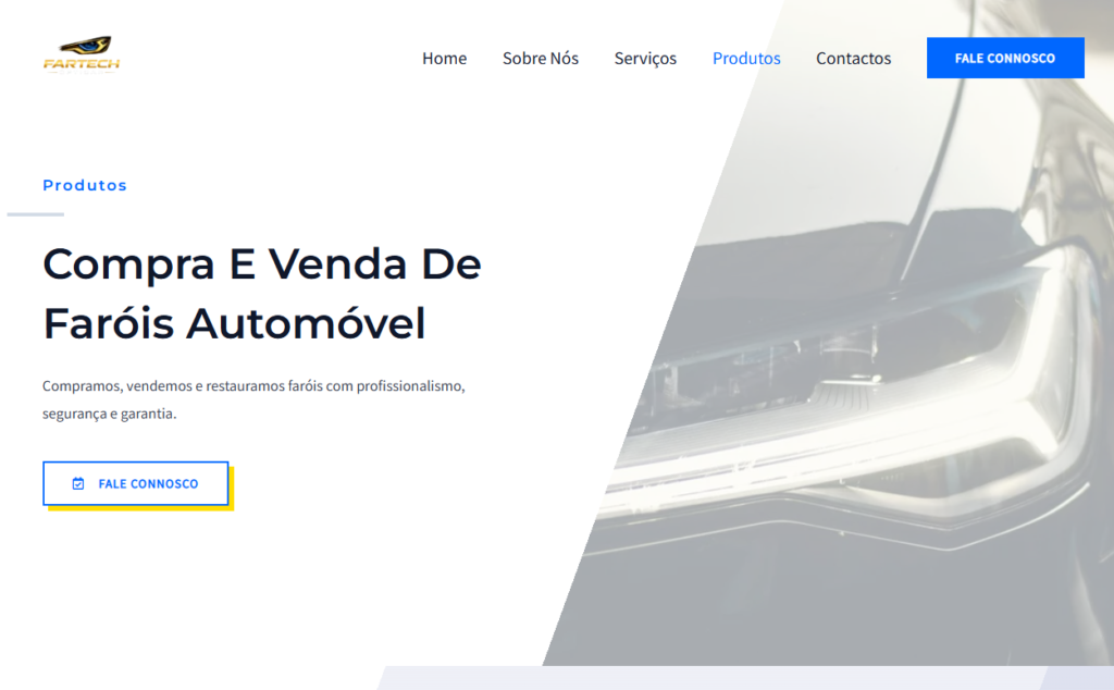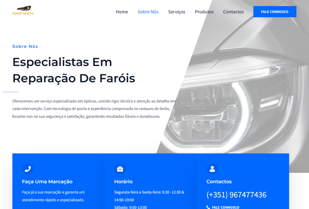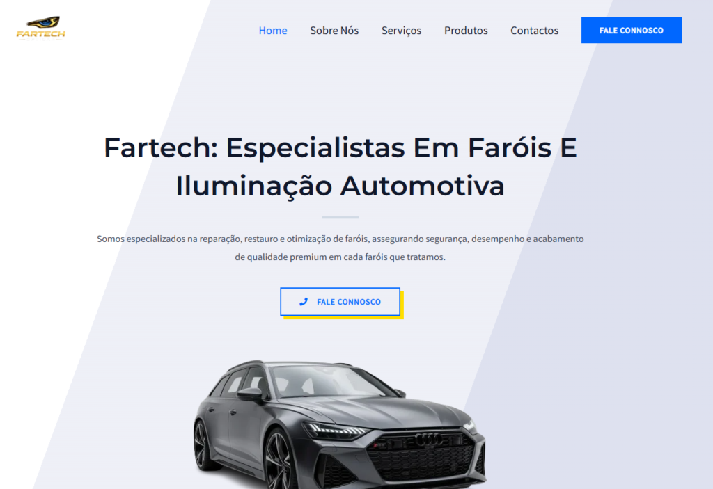 O projeto para a Fartech transpõe a especialização em reparação e restauro de faróis para uma plataforma digital que respira clareza e detalhe. A identidade visual foi desenhada para refletir tecnologia e segurança, utilizando uma paleta de azuis elétricos e cinzas metálicos, que comunicam o rigor técnico e a transparência de um serviço de restauro de alta qualidade.