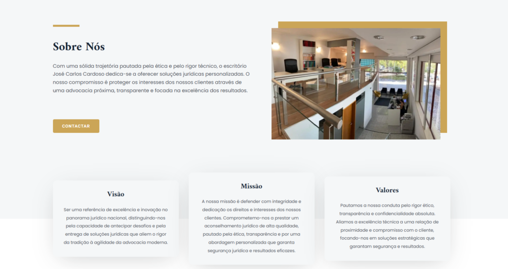 O projeto para a José Carlos Cardoso & Associados (JCCASS) transpõe o rigor e a ética da advocacia para uma plataforma digital de excelência. A identidade visual foi desenhada para equilibrar a tradição jurídica com a modernidade, utilizando uma paleta de amarelos, cinzentos e brancos que comunicam autoridade, confiança e estabilidade.